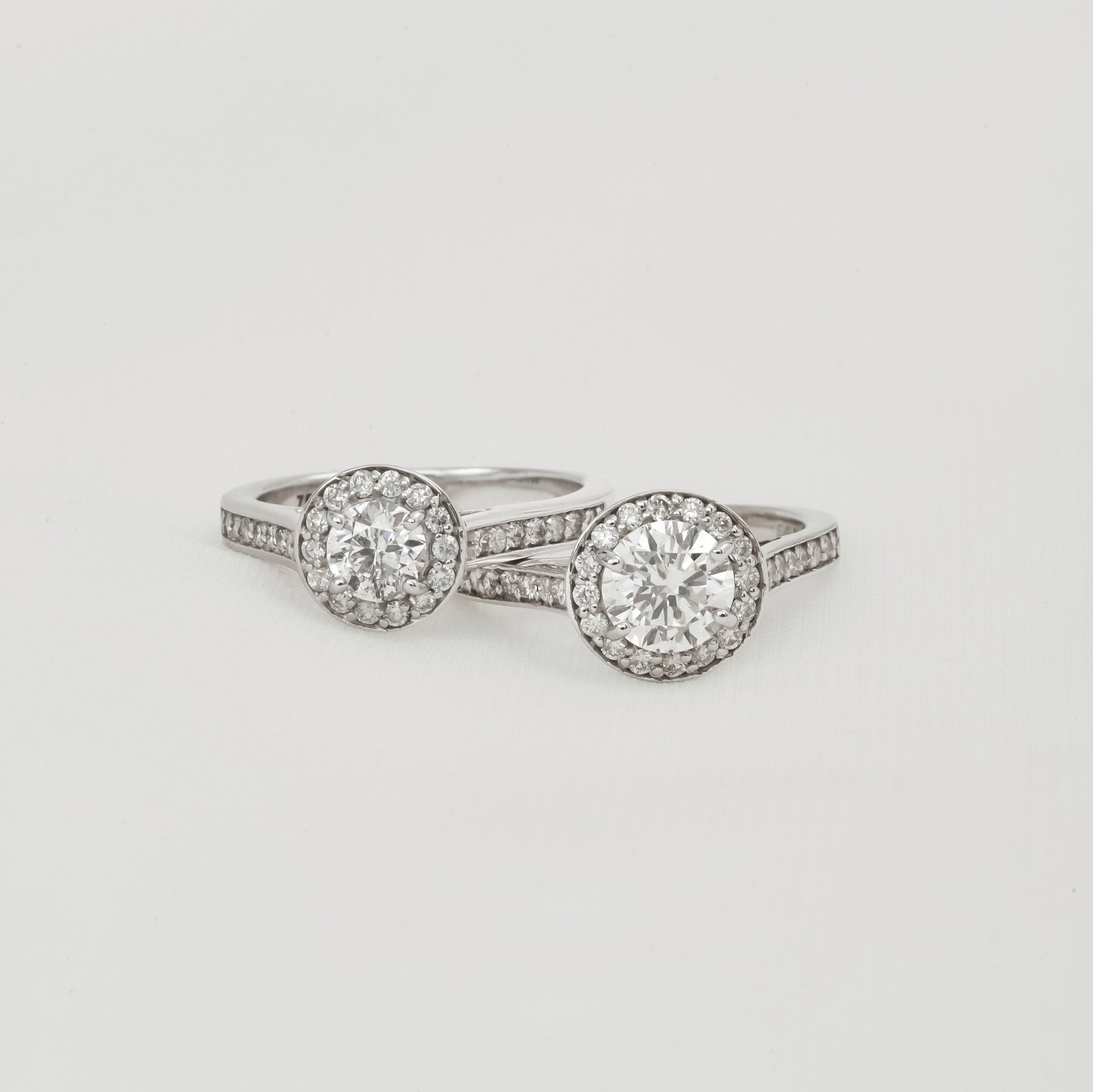 Anel feito em ouro 18k com um diamante central redondo de 1.01 quilates, complementado por diamantes menores em volta da pedra central e no aro, que totalizam 0.31 quilate.