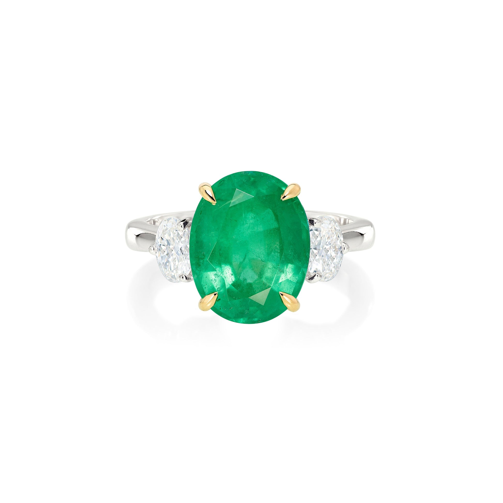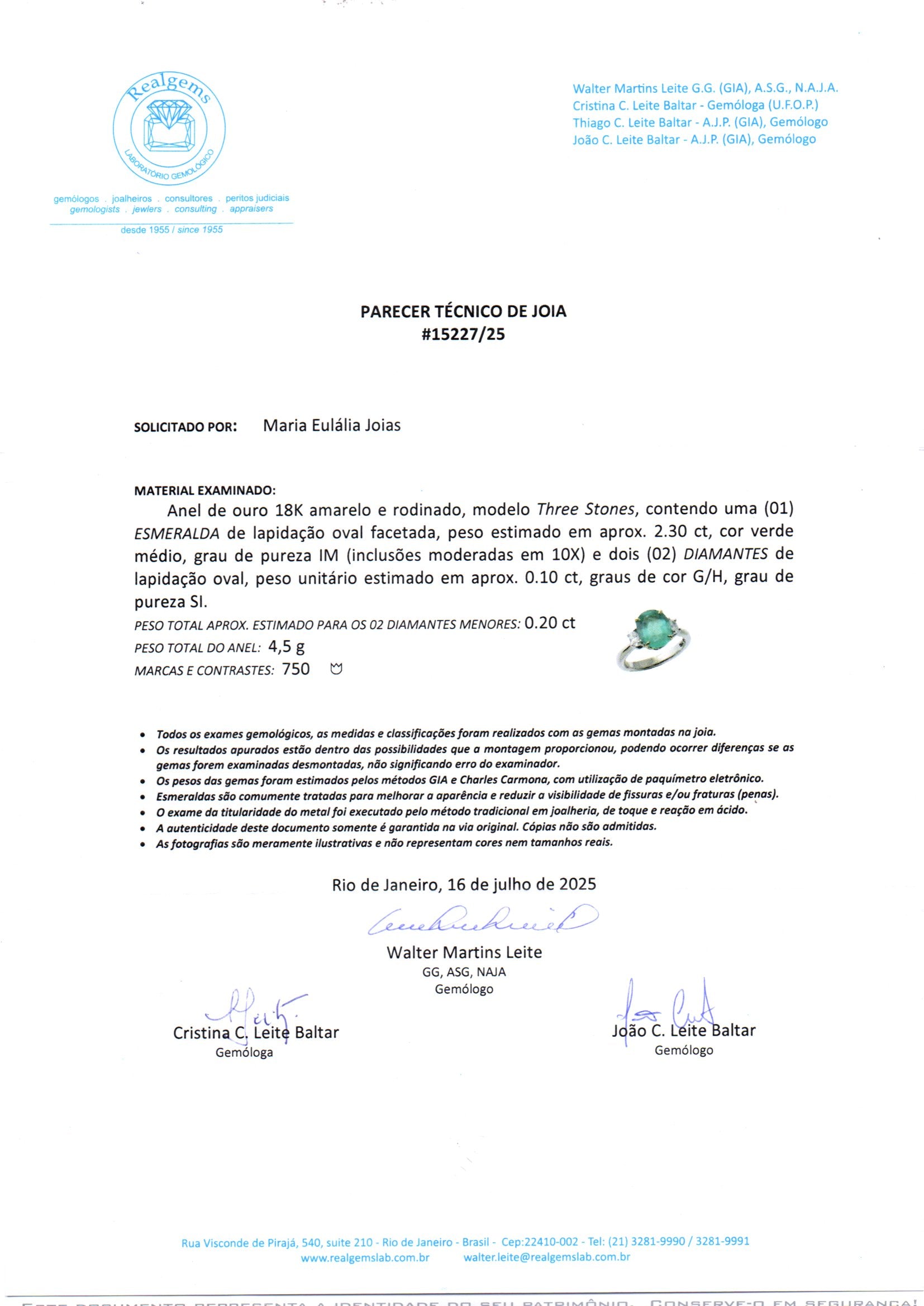 Feito em ouro branco e amarelo 18k, este anel ganha uma esmeralda central na lapidação oval com 2.28 quilates, ladeado por dois diamantes na mesma lapidação, totalizando 0.22 quilate.