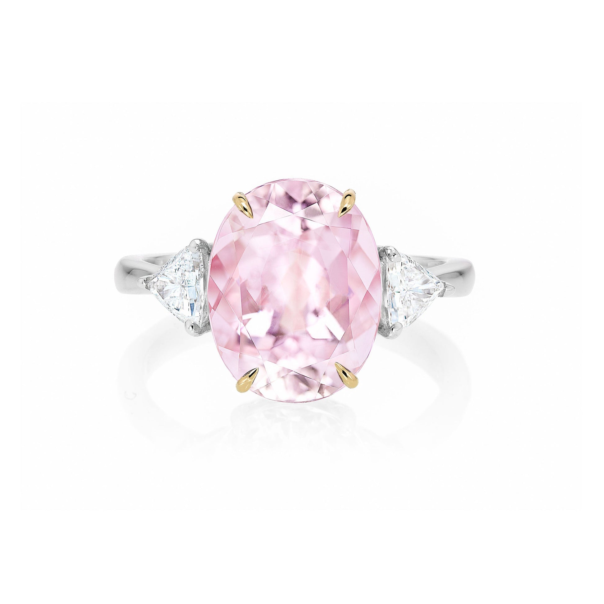 Anel feito com uma elegante mistura nas tonalidades do ouro. O aro em ouro branco e a caixa da pedra central em ouro amarelo, ambos 18K, garantem uma elegância atemporal à peça. O rosa suave da Kunzita em lapidação oval de 4.68 quilates é enaltecido pelos diamantes na lapidação Trillion, que somam 0.32 quilate.