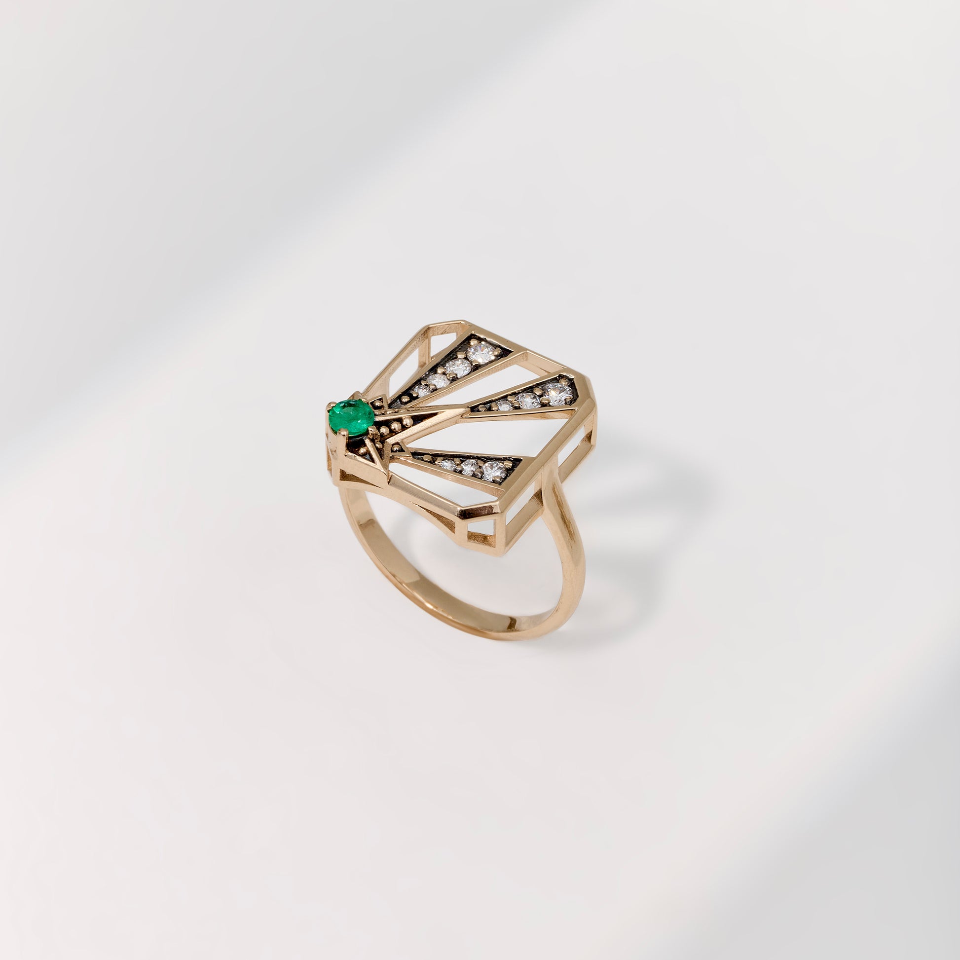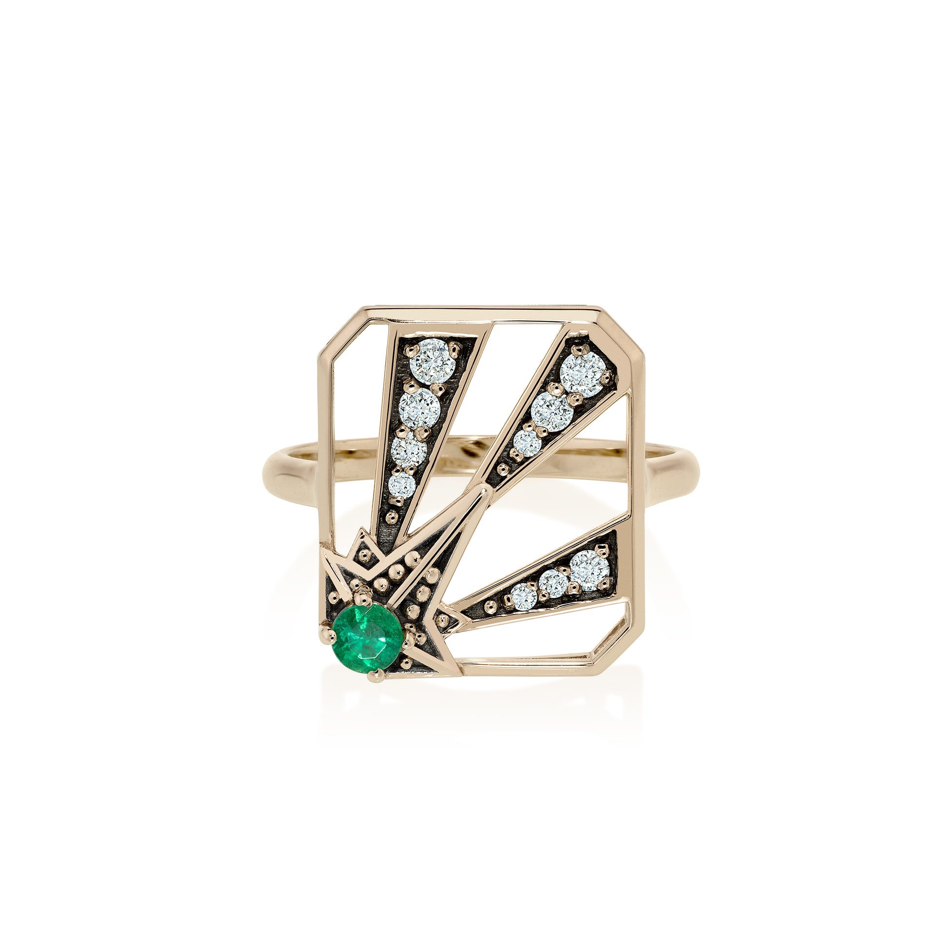 A esmeralda brilha como um ponto de luz no espaço, cercada pelos delicados reflexos dos brilhantes que evocam o cintilar das estrelas. O ouro champanhe sustenta a peça com suavidade e calor, traduzindo em forma a serenidade e o mistério do céu noturno.