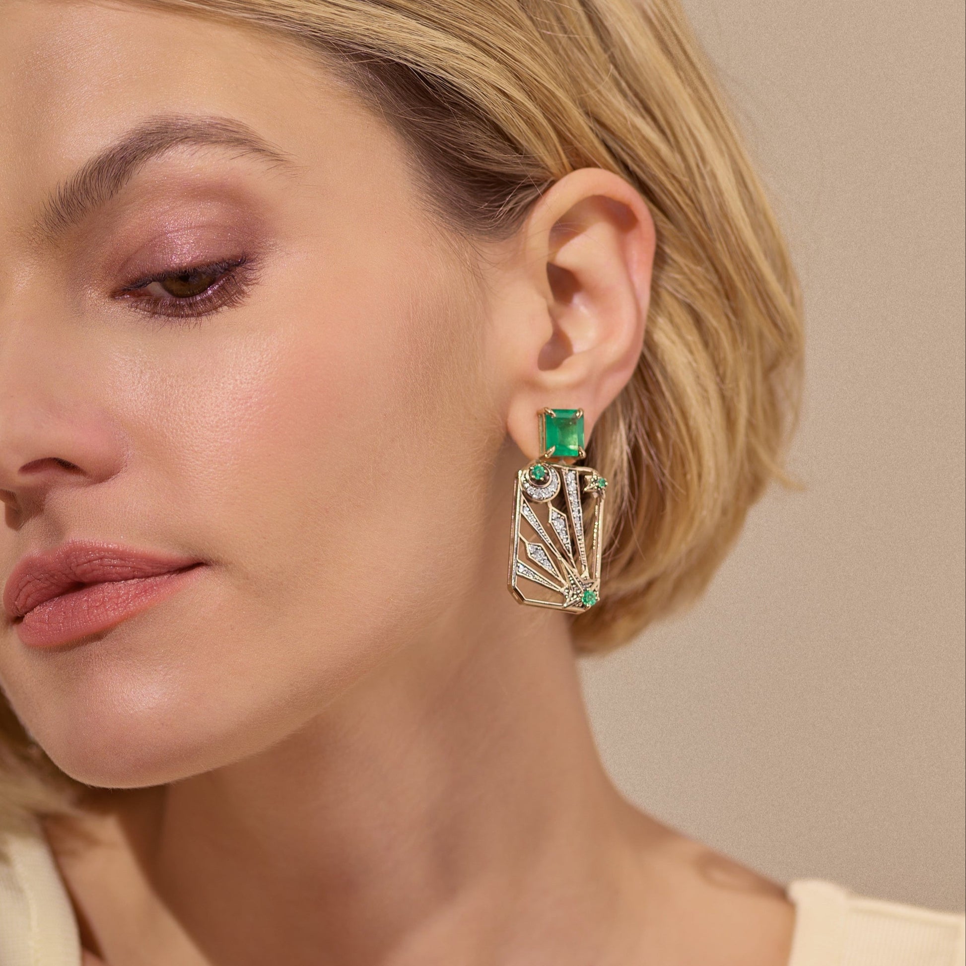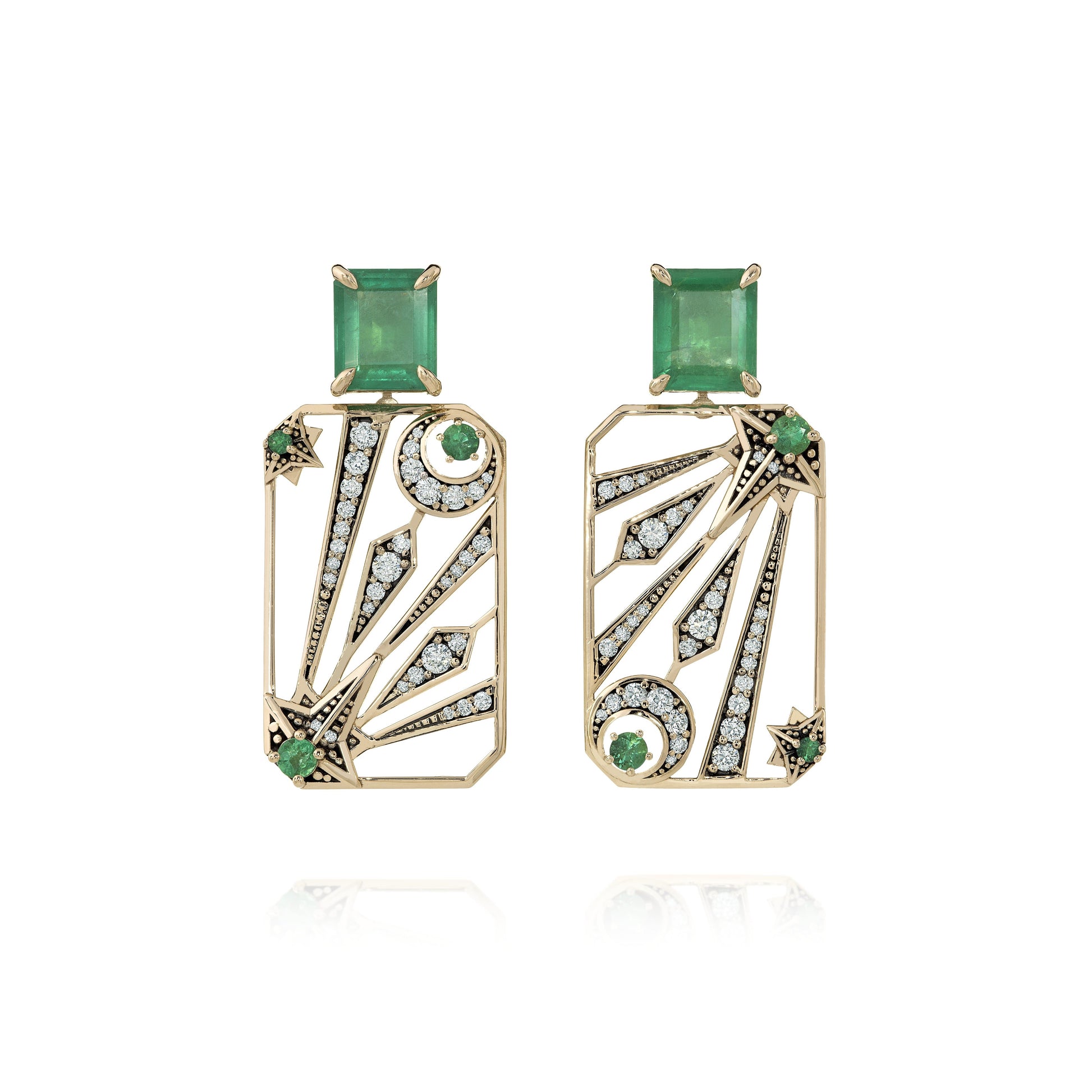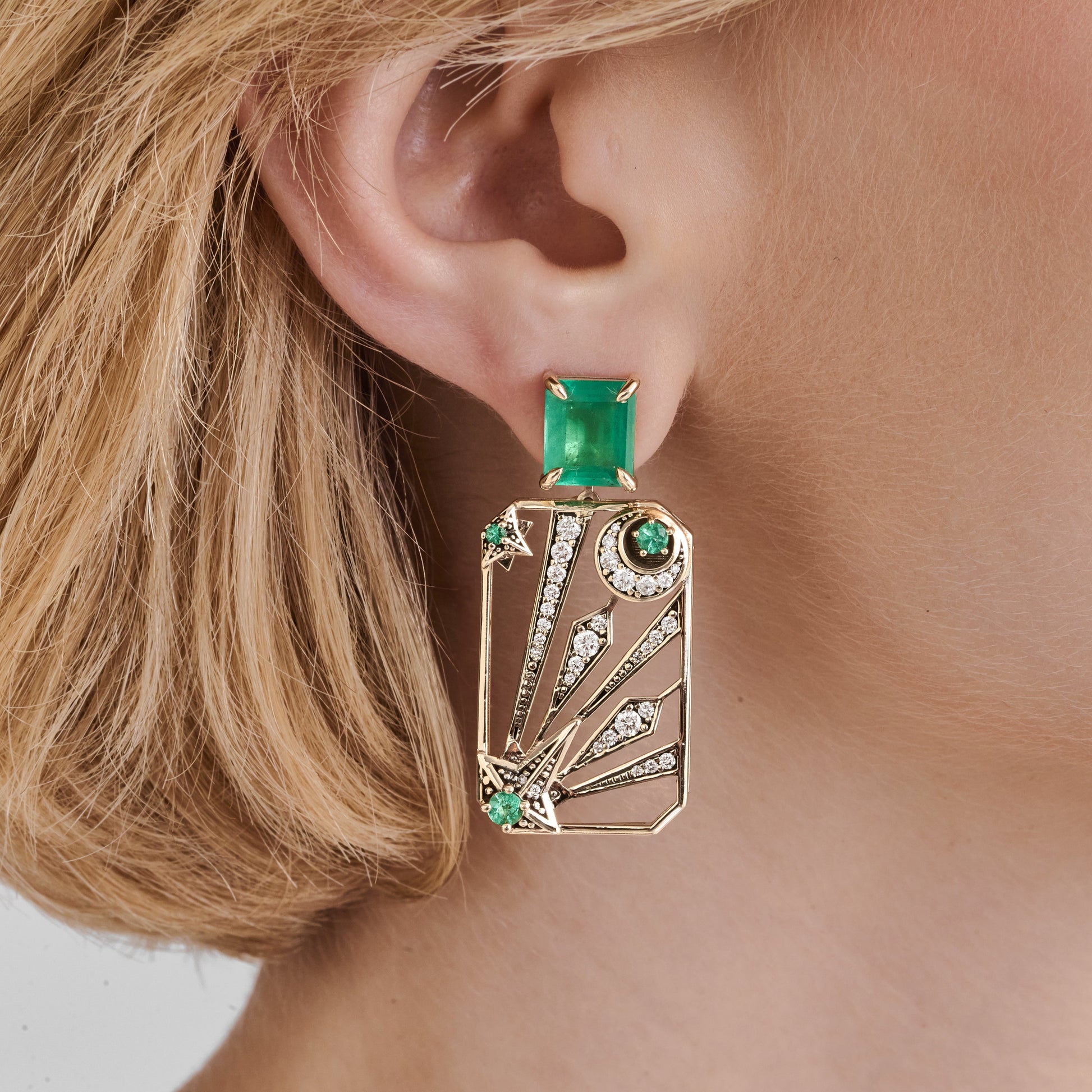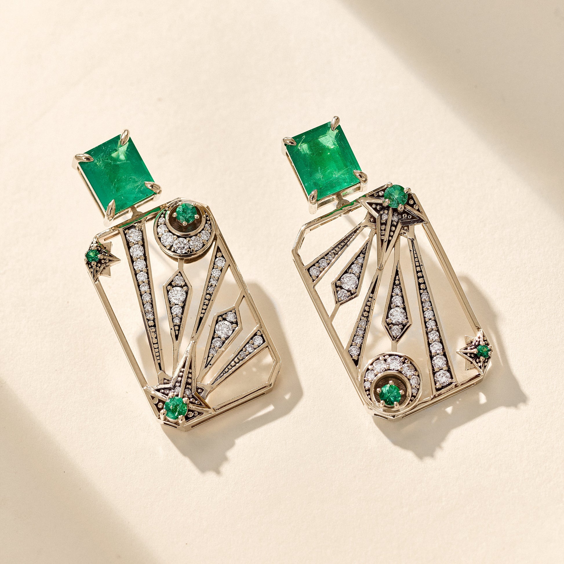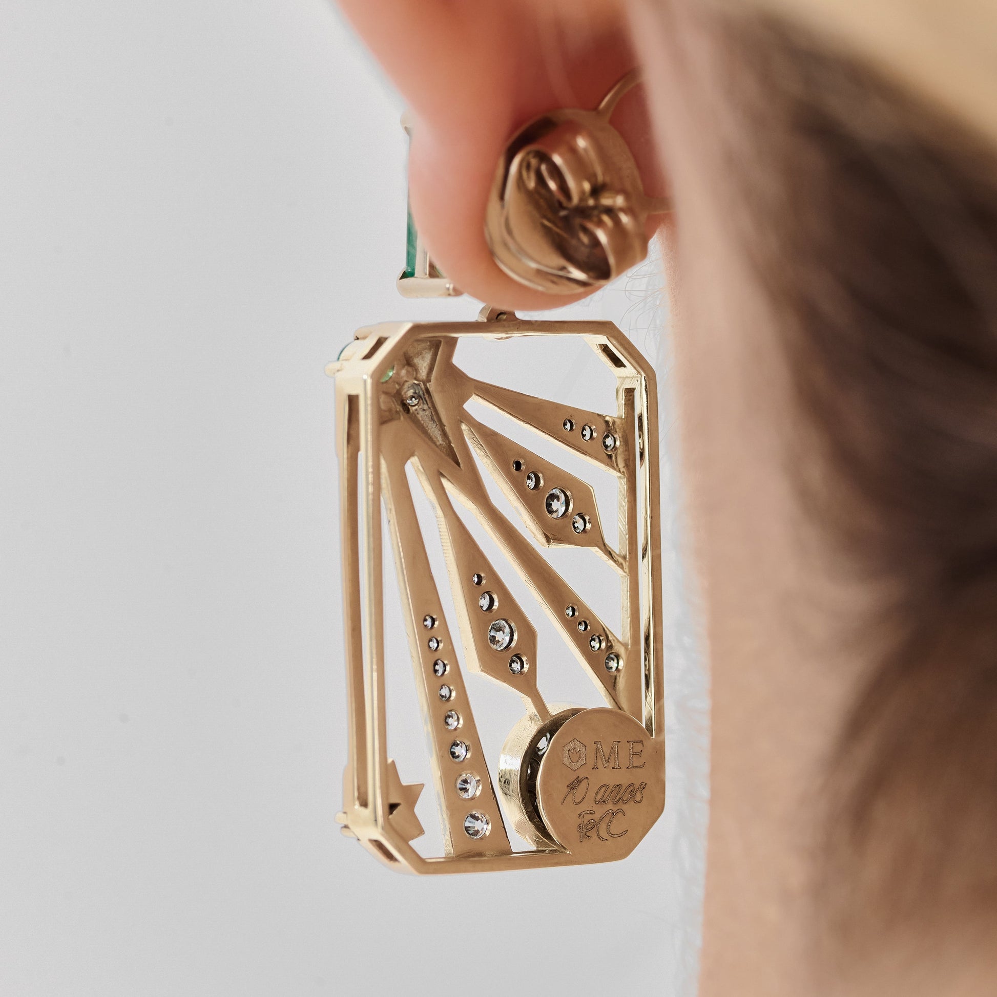 Esmeraldas em lapidação emerald cut que totalizam 6.5 quilates, esmeraldas redondas de aproximadamente 0.5 quilate e brilhantes com cerca de 1.1 quilate compõem o brinco Luce, feito em ouro 18K.