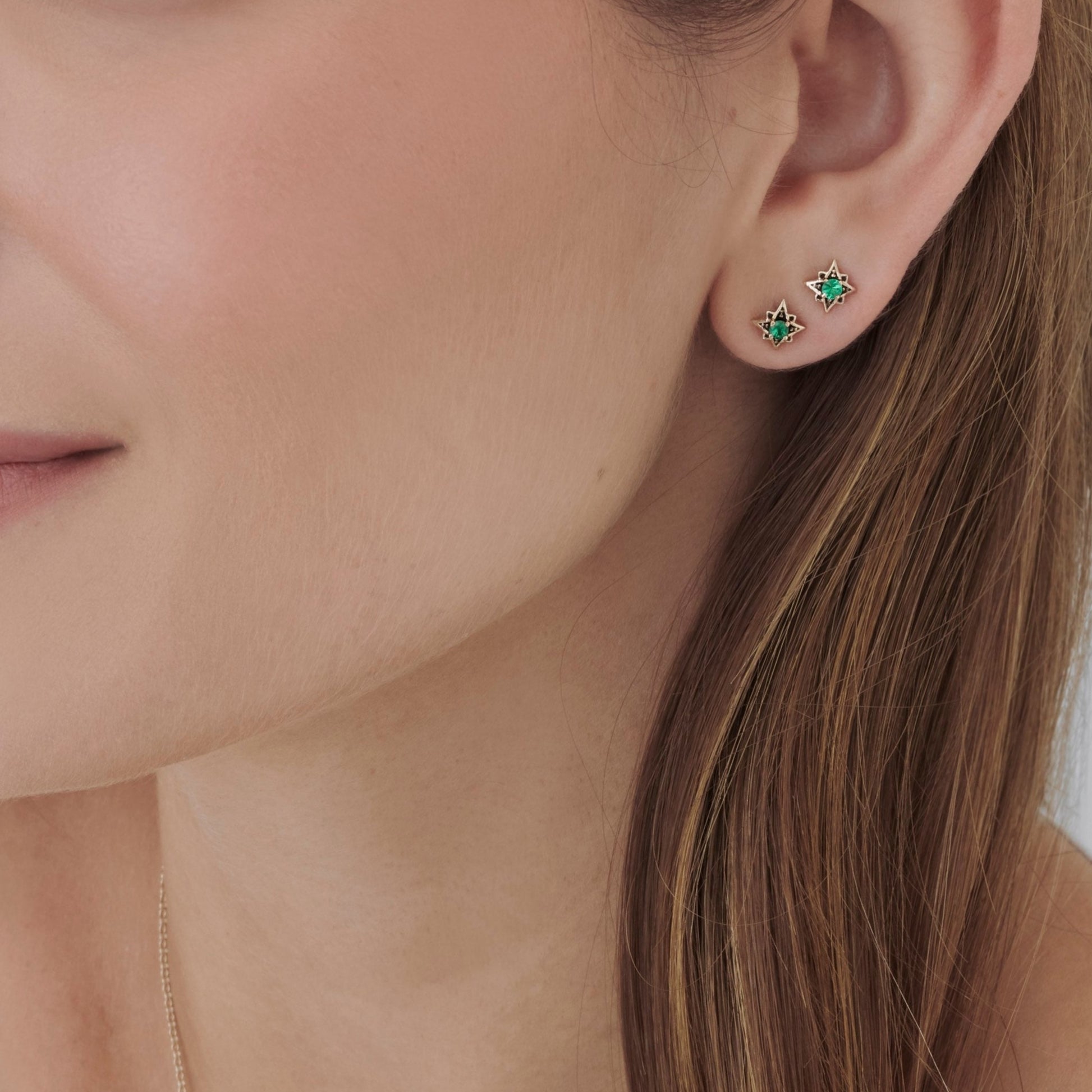 Ideal para crianças ou para ser usado no segundo furo, o Brinco Vega Mini alia design e charme com o verde da esmeralda no ouro champanhe.