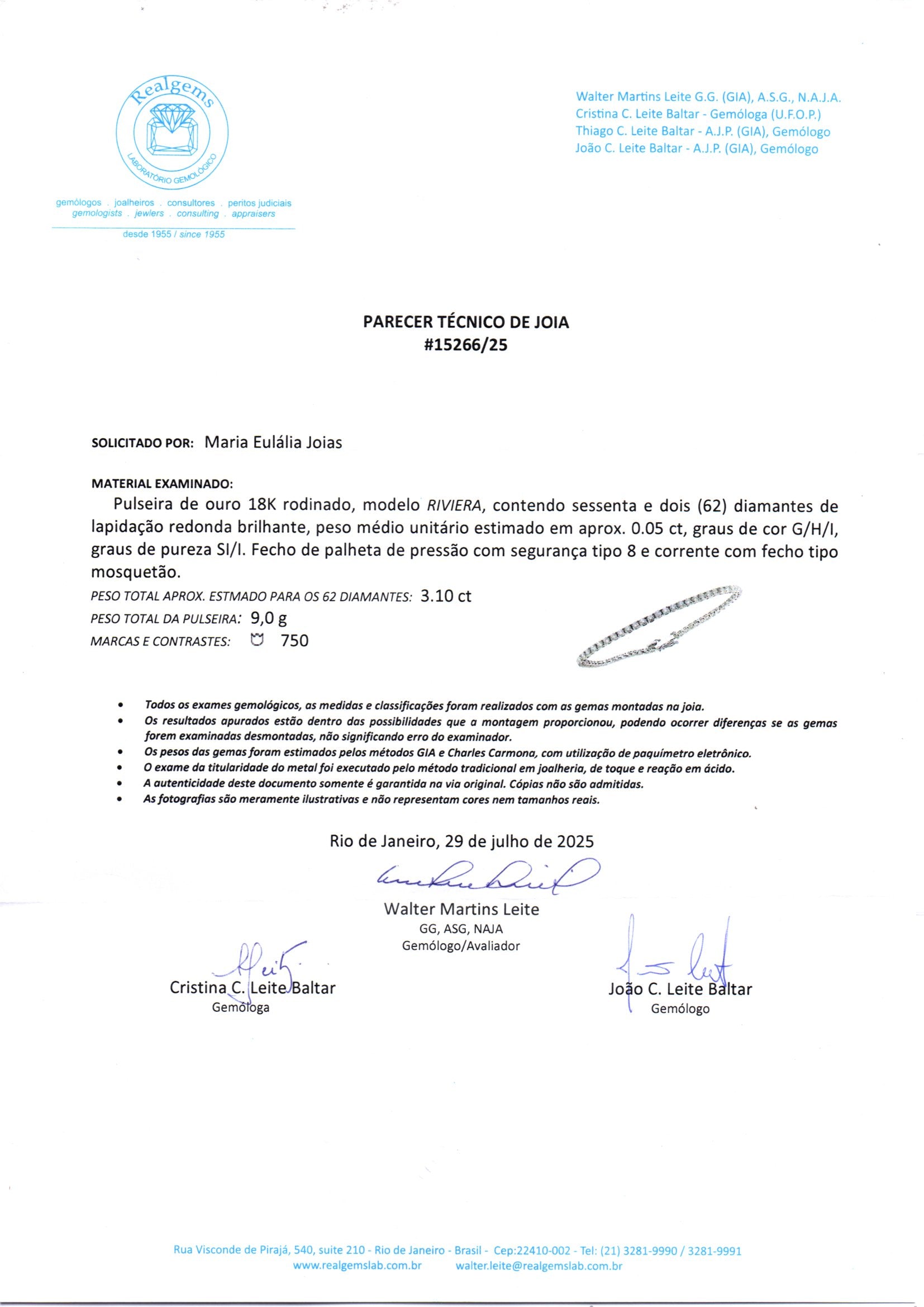 Pulseira Riviera feita em ouro branco 18K e brilhantes que somam aproximadamente 3.1 quilates.